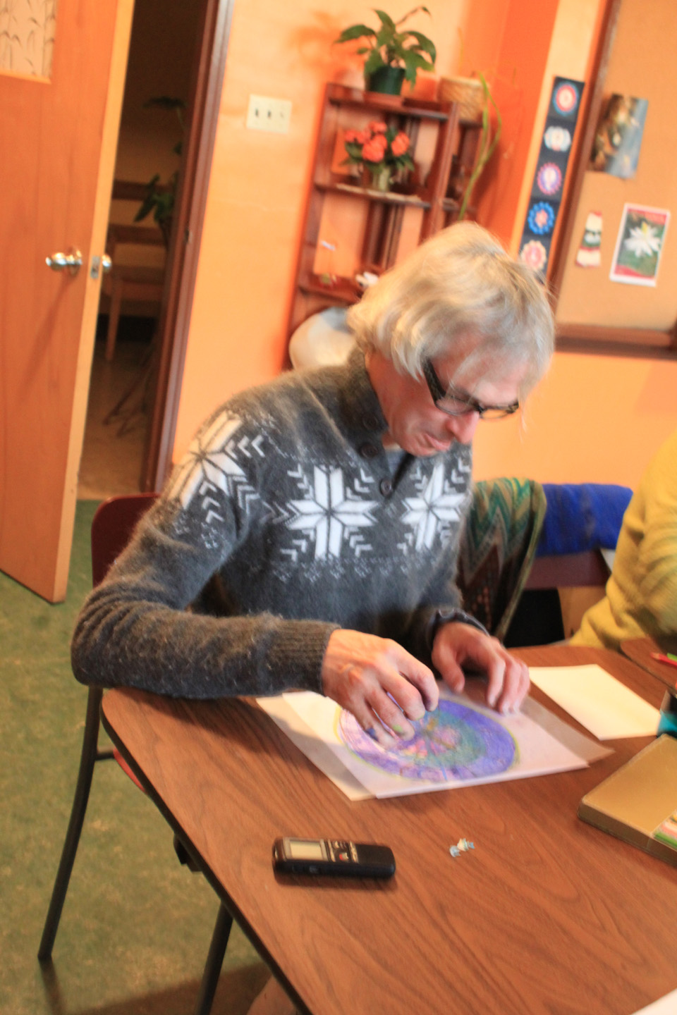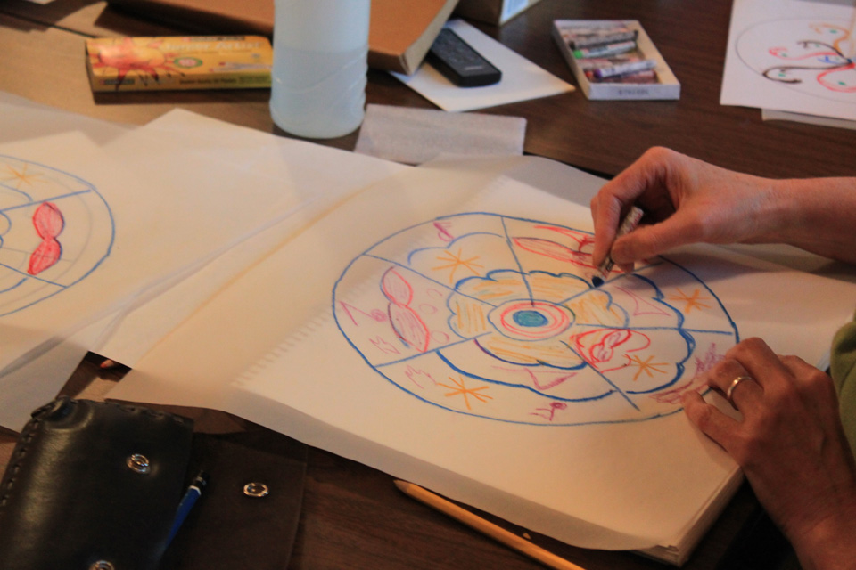 La réalisation d'un mandala ne se fait pas sous pression, tout au contraire. On peut avoir l'impression ou la volonté de se concentrer mais ne pas avoir l'effet réel. En se plaçant dans un état d'abandon, l'inconscient refait surface. Il suffit d'être présent à cette montée de soi-même qui surgit parce qu'on lui fait de la place, tout simplement.